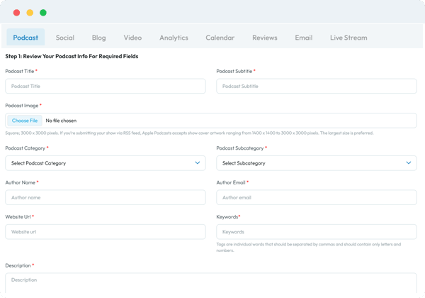 PodUp’s Setup tool provides an easy-to-use interface that walks you step-by-step through pre-launch, from integrating with podcasting and social platforms, setting up your domain name, adding team members and permissions and MORE!